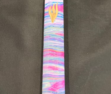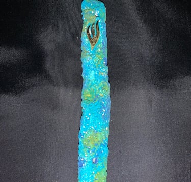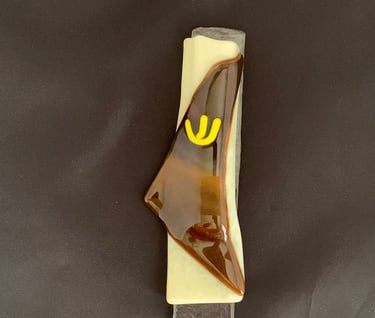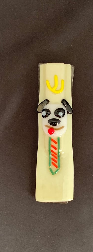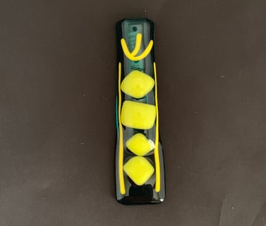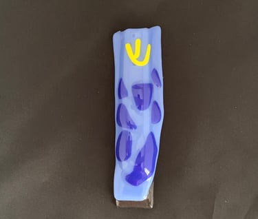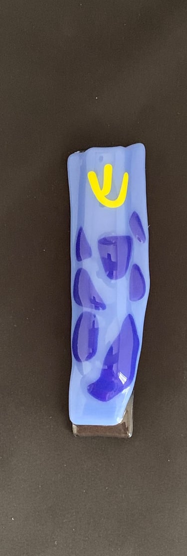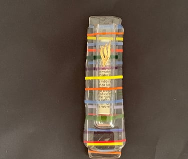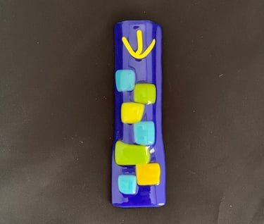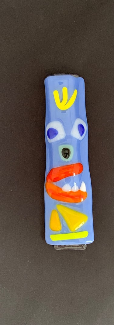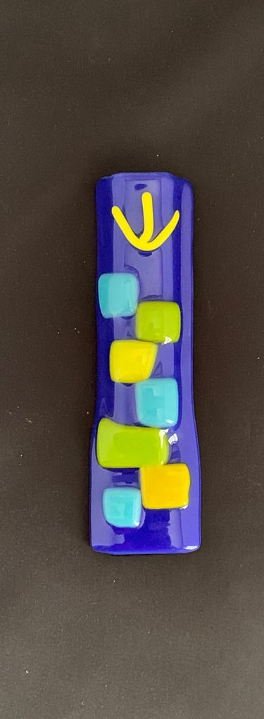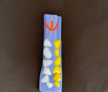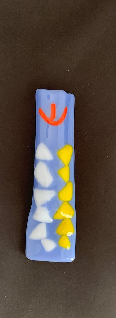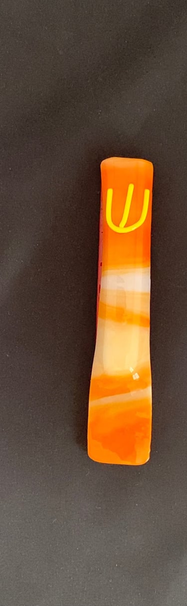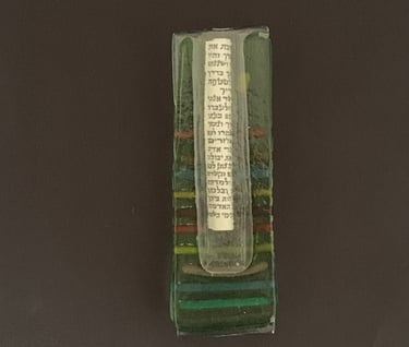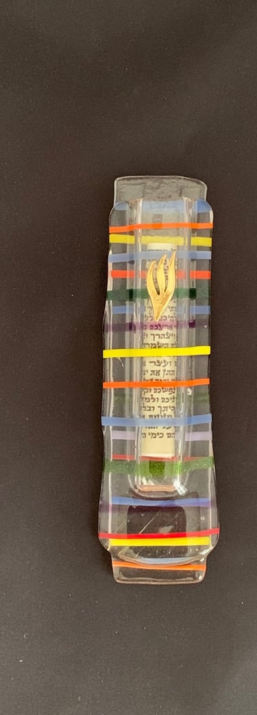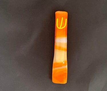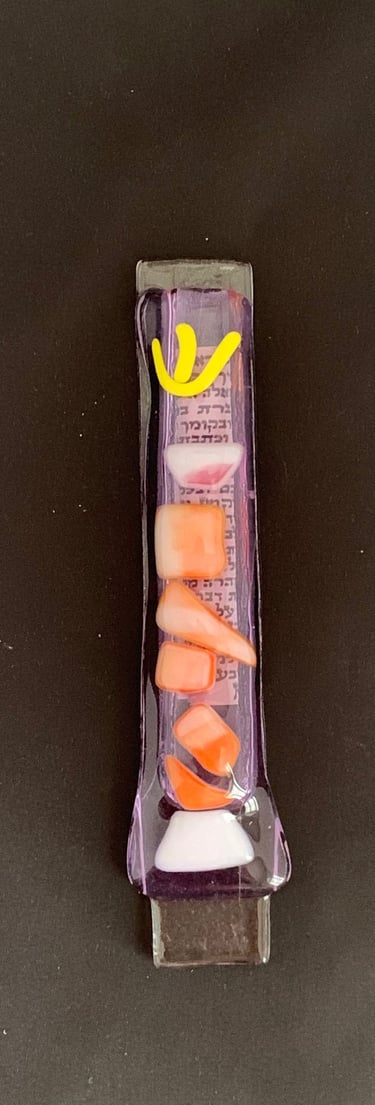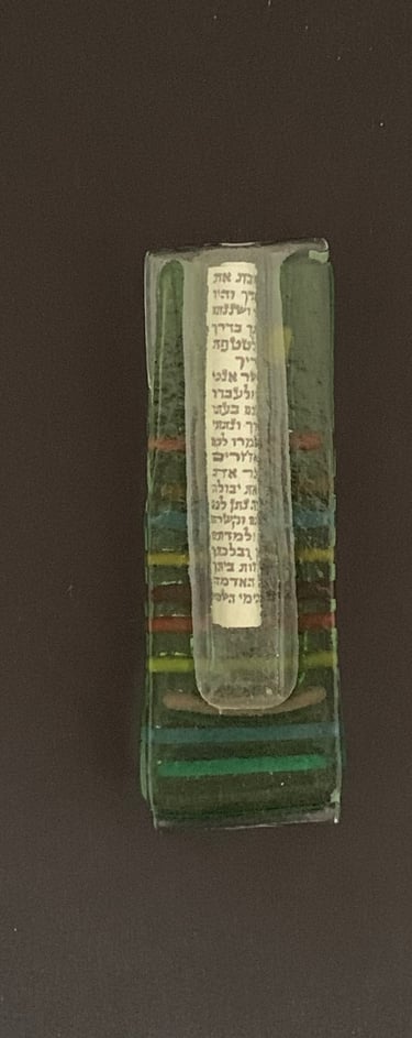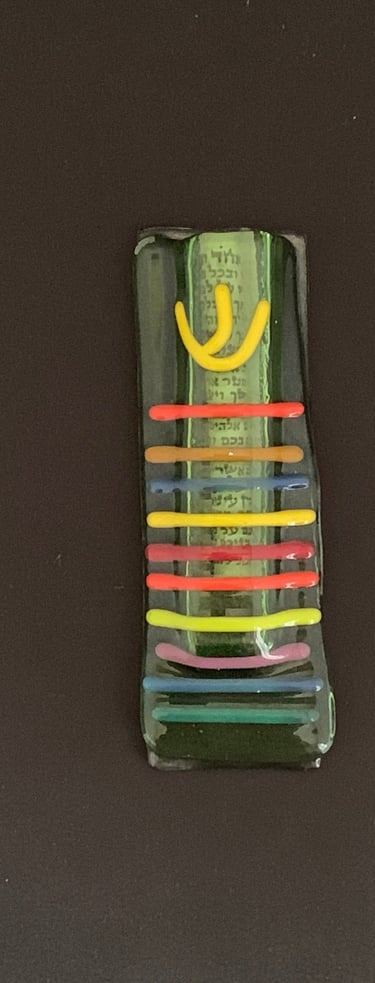 The Shin Letter is fabricated from glass rods that are heated and bent to the proper shape and fired . Then the scroll is placed between the glass in the created pocket..