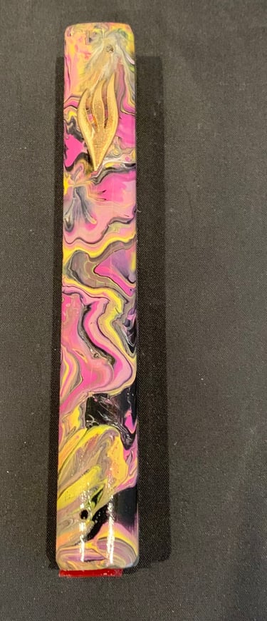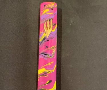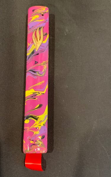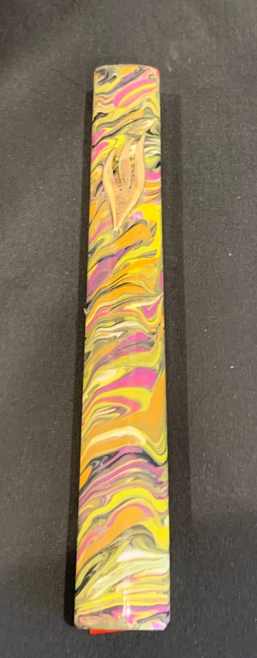 A very unique piece of coral that was shaped and recolored to have a very vibrant appeal on your doorpost. It has a cut out in the rear with a wooden block keeping the scroll in place. It comes with 2 sized screws to mount on your doorpost ..